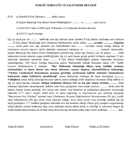 Geri Gönderme Merkezinde Yapılan Uluslararası Koruma Başvurusuna İstinaden Salıverme ve İkamet İline Yönlendirme Kararı Tebliğ Tebellüğ Belgesi