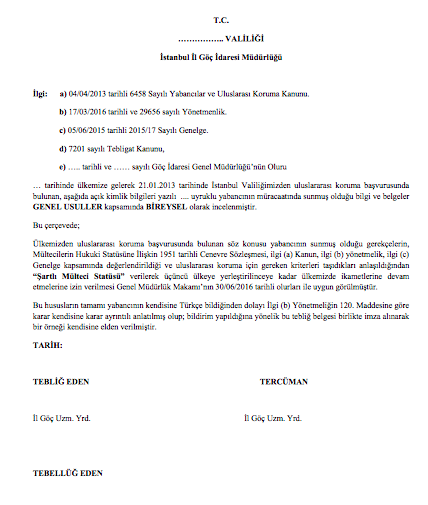 Şartlı Mülteci Statüsü Kararı Tebliğ Tebellüğ Belgesi